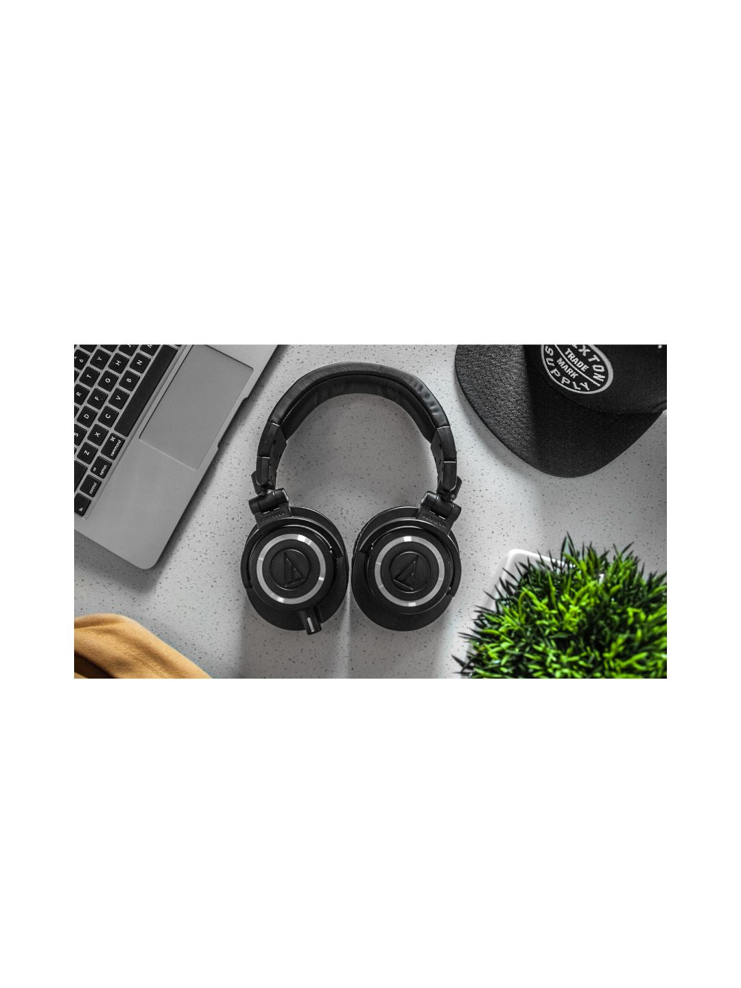 Black Audio-Technica headphones, over-ear design, studio-quality sound.